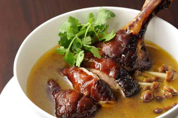 かくれんぼ横丁の一角に佇む「神楽坂 芝蘭」は石畳に黒塀、格子という花街神楽坂に調和する外観。四川料理は「麻」「辣」「香」をベースにさまざまな旨みがバランスよく一体となった料理です。四川には多彩な鴨料理がありますが、「芝蘭」の看板料理は、こんがりとローストした皮付き鴨肉を特製スープに浸したもの。これが名物の「四川ダック」です。